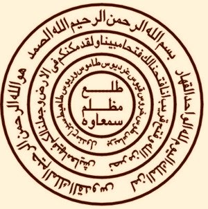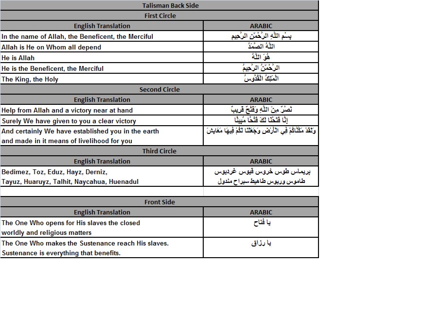 At the four corners are the names of four Angels, Gebrael, Izrael, Israfel and Michael. Then a magical square having numbers equivalent to 797 which are the numbers of two names of Allah, Ya Fatah Ya Razzaq. These names are also written on the upper side of magical square. This talisman is used for prosperity, abundance, victory in every field of life. It starts with numbers (66) which are equivalent to the name Allah. On the back of the talisman, which you can see to right, going from top to bottom, first are two circles containing Quranic verses and Names of Allah for victory and removing obstacles in every part of life. In 3rd circle are the names of the spirits of the planet Saturn from the Ghayat al Hakim in Arabic and from Picatrix in the Greer/Warnock translation. In the last circle are the the names of these spirits in Arabic. Here is a complete English/Arabic translation.